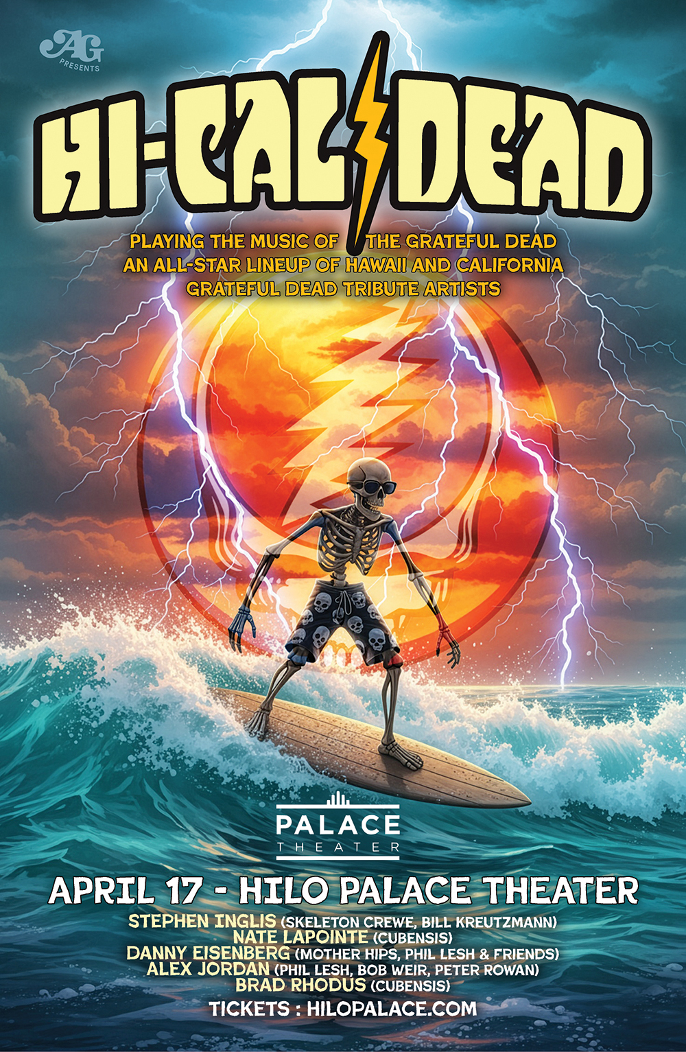 Introducing “HI-CAL Dead”, an all-star lineup of Hawaii and California Grateful Dead tribute artists, flying in for a three-island run this April. Individually the band has played with legends from the Grateful Dead Family, but also play with some of the best tribute bands. Weʻre excited to be presenting this lineup for a Hawaii tour celebrating the music of the Grateful Dead.